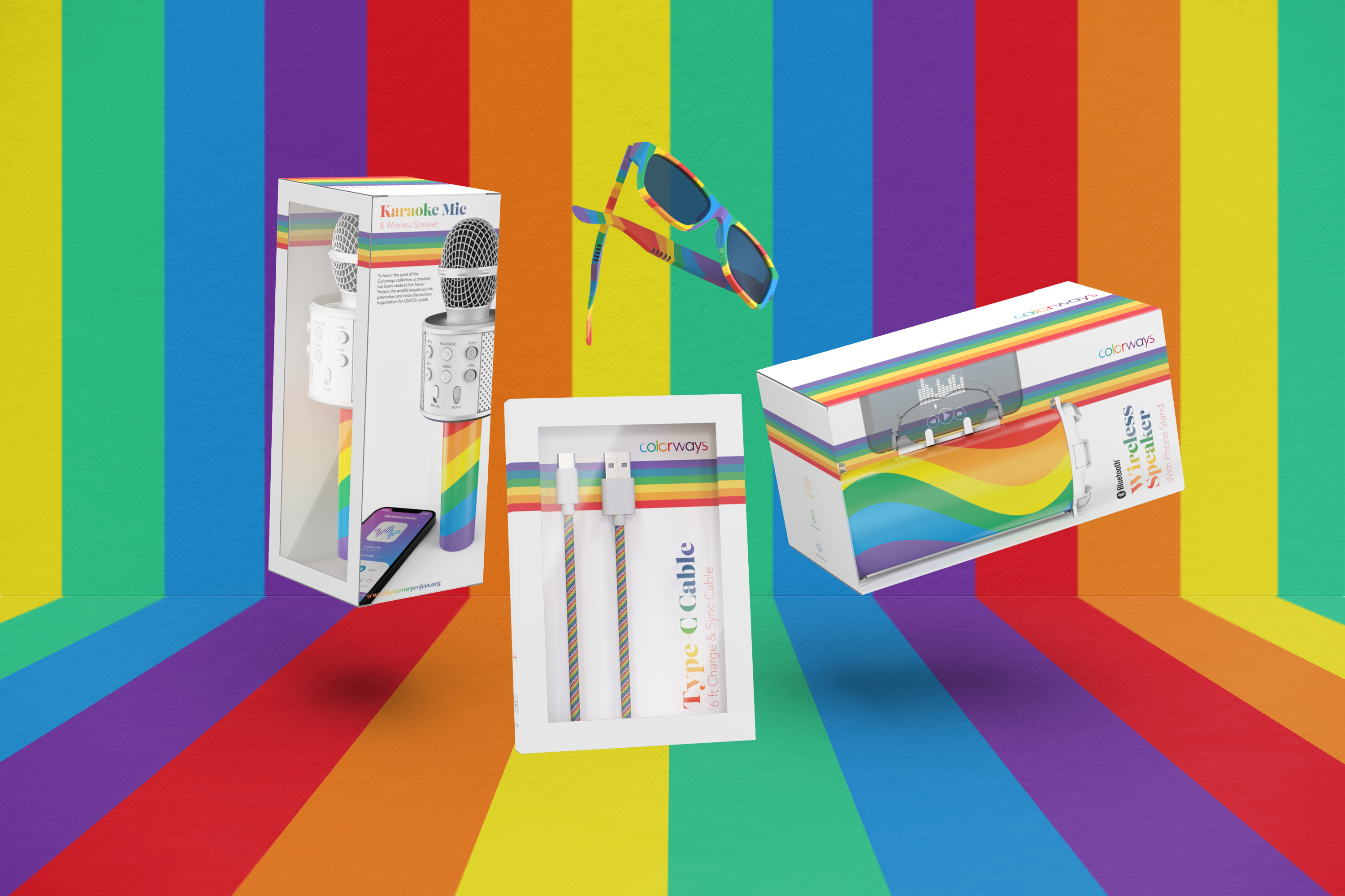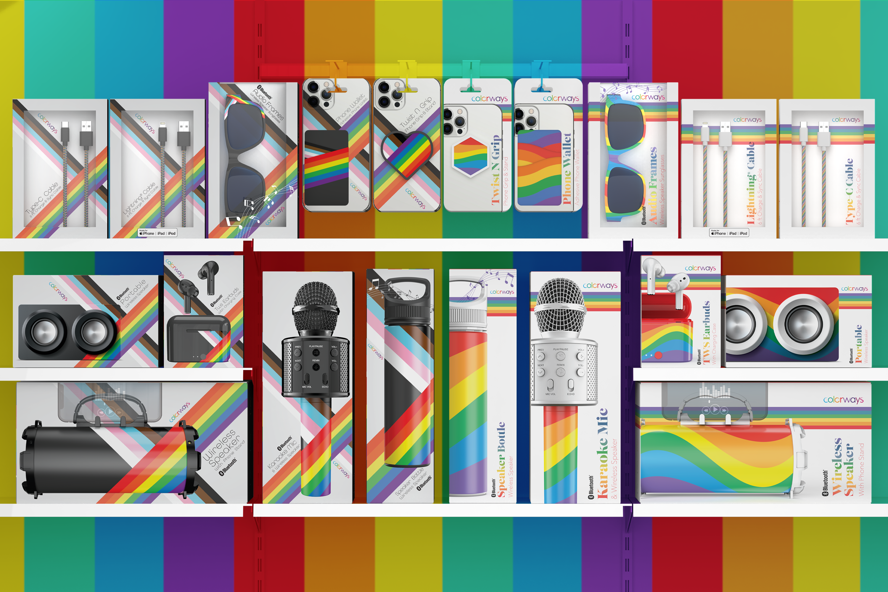 The packaging design for Colorways Pride, a line of consumer audio and phone accessories designed for LGBT pride, involved a strategic exploration of visual elements to encapsulate inclusivity and vibrancy. Focused on communicating a sense of pride and unity, the resulting packaging design complements the functionality of the products while standing as a visual representation of Colorways’ commitment to supporting and celebrating the LGBTQ+ community.