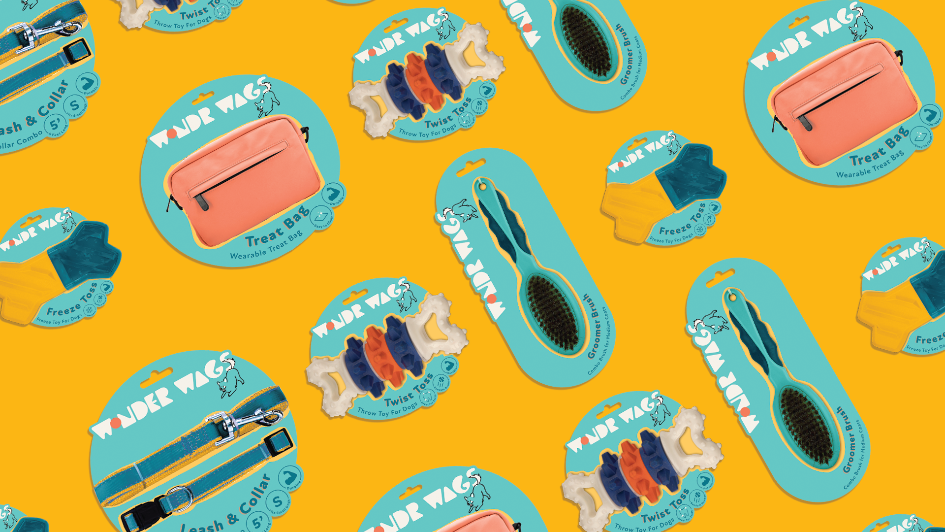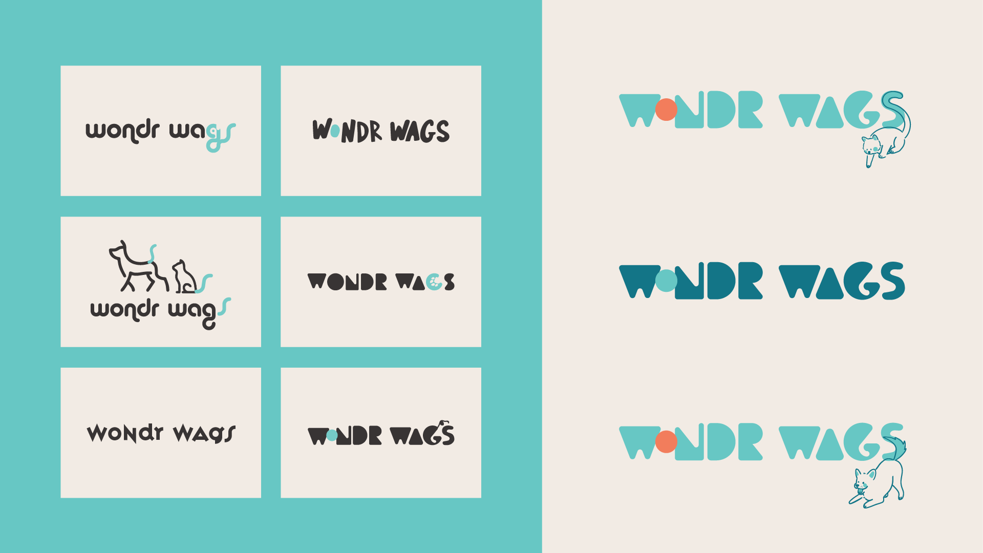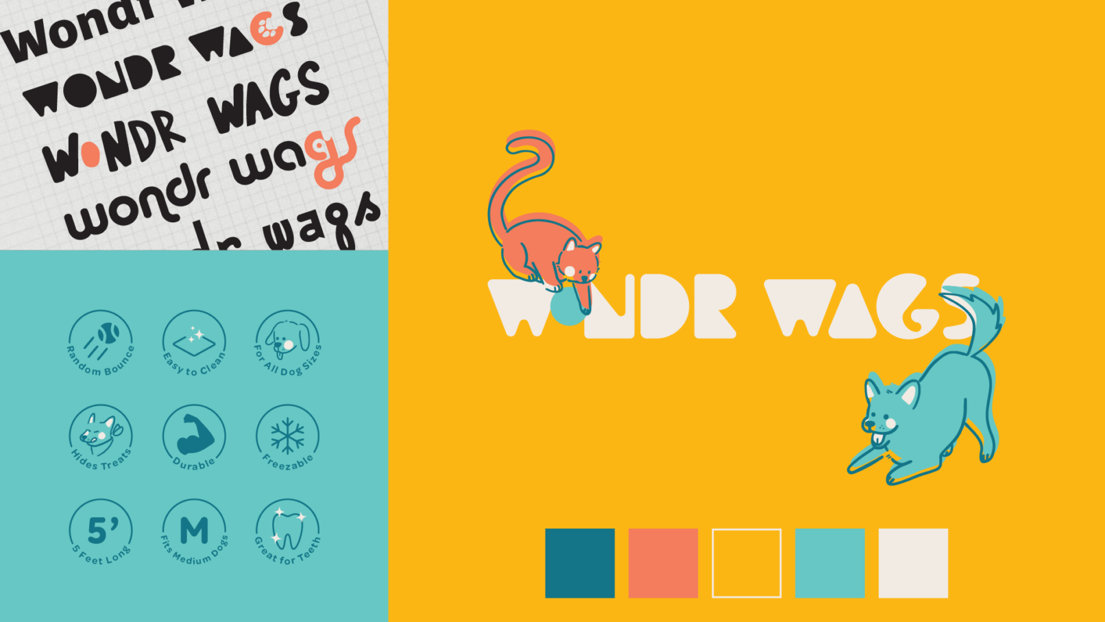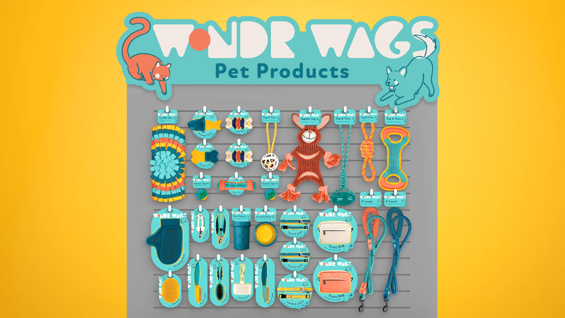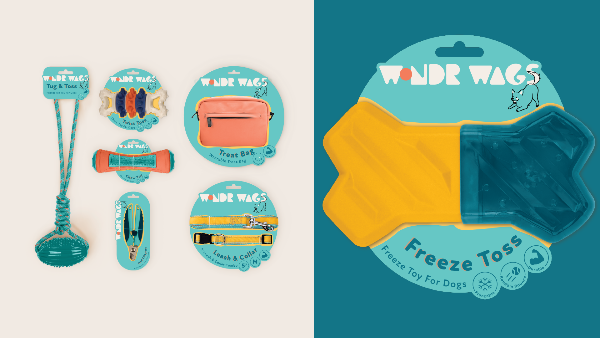 Wonder Wags was a vibrant new pet toy line that set out with the goal of standing out. Infused with bright colors and a playful aesthetic, the logo design process for Wonder Wags involved capturing the joy and energy that pets bring to our lives. The logo embodies the lighthearted spirit of the brand, incorporating a wagging tail from a cat or dog depending on the line. Each color was carefully chosen to evoke a sense of excitement and playfulness, creating a cohesive and visually engaging identity. The outcome is a brand and packaging design that not only appeals to pet owners but also communicates the sheer delight and enthusiasm that Wonder Wags brings to our furry friends.